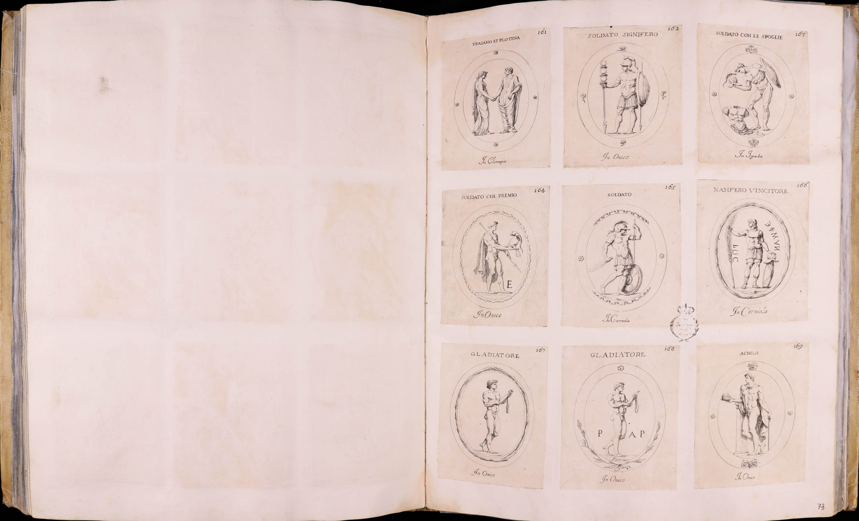 Primera edición del primer volumen de dos (incompleto, faltan las primeras hojas de la dedicatoria al papa Alejandro VII, advertencia al lector e índice de las láminas), que recoge la colección de camafeos y gemas del cardenal Francesco Barberini en 214 aguafuertes.