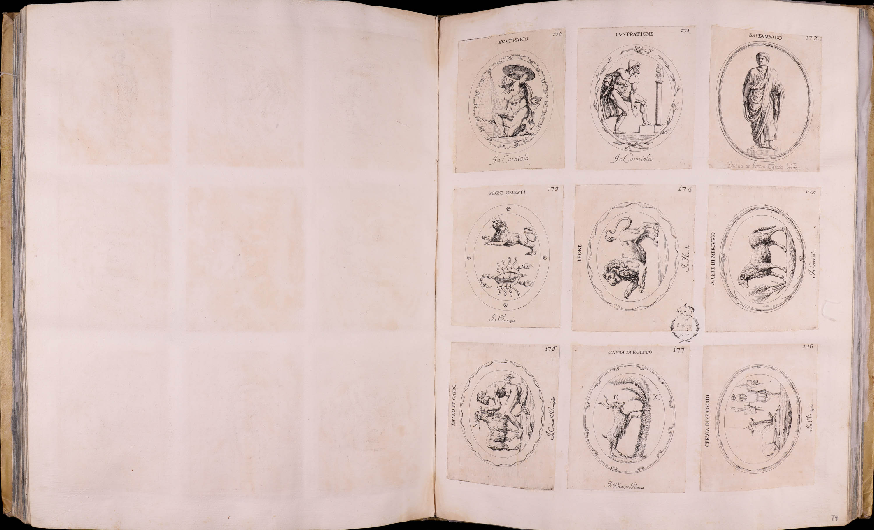 Primera edición del primer volumen de dos (incompleto, faltan las primeras hojas de la dedicatoria al papa Alejandro VII, advertencia al lector e índice de las láminas), que recoge la colección de camafeos y gemas del cardenal Francesco Barberini en 214 aguafuertes.