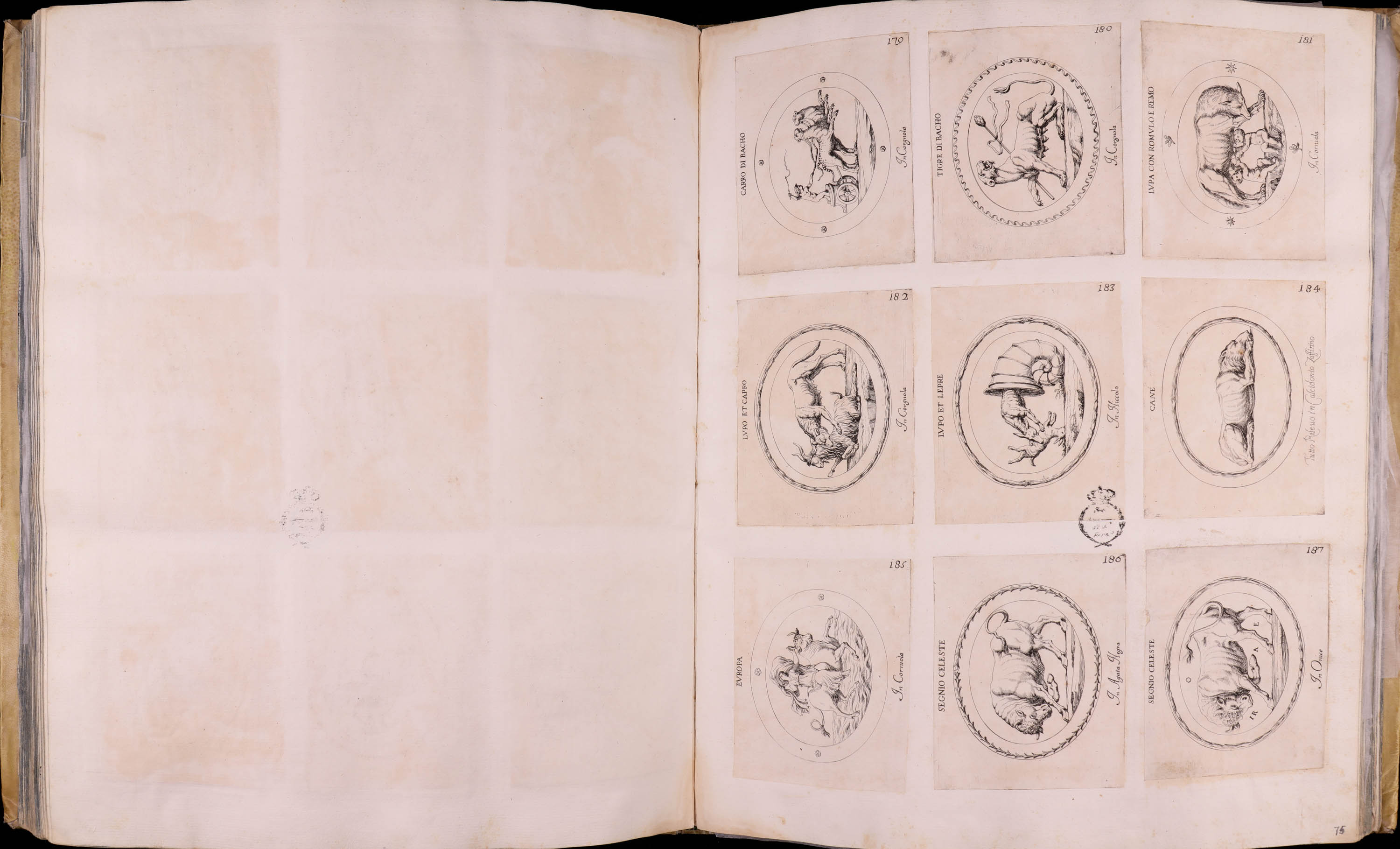 Primera edición del primer volumen de dos (incompleto, faltan las primeras hojas de la dedicatoria al papa Alejandro VII, advertencia al lector e índice de las láminas), que recoge la colección de camafeos y gemas del cardenal Francesco Barberini en 214 aguafuertes.