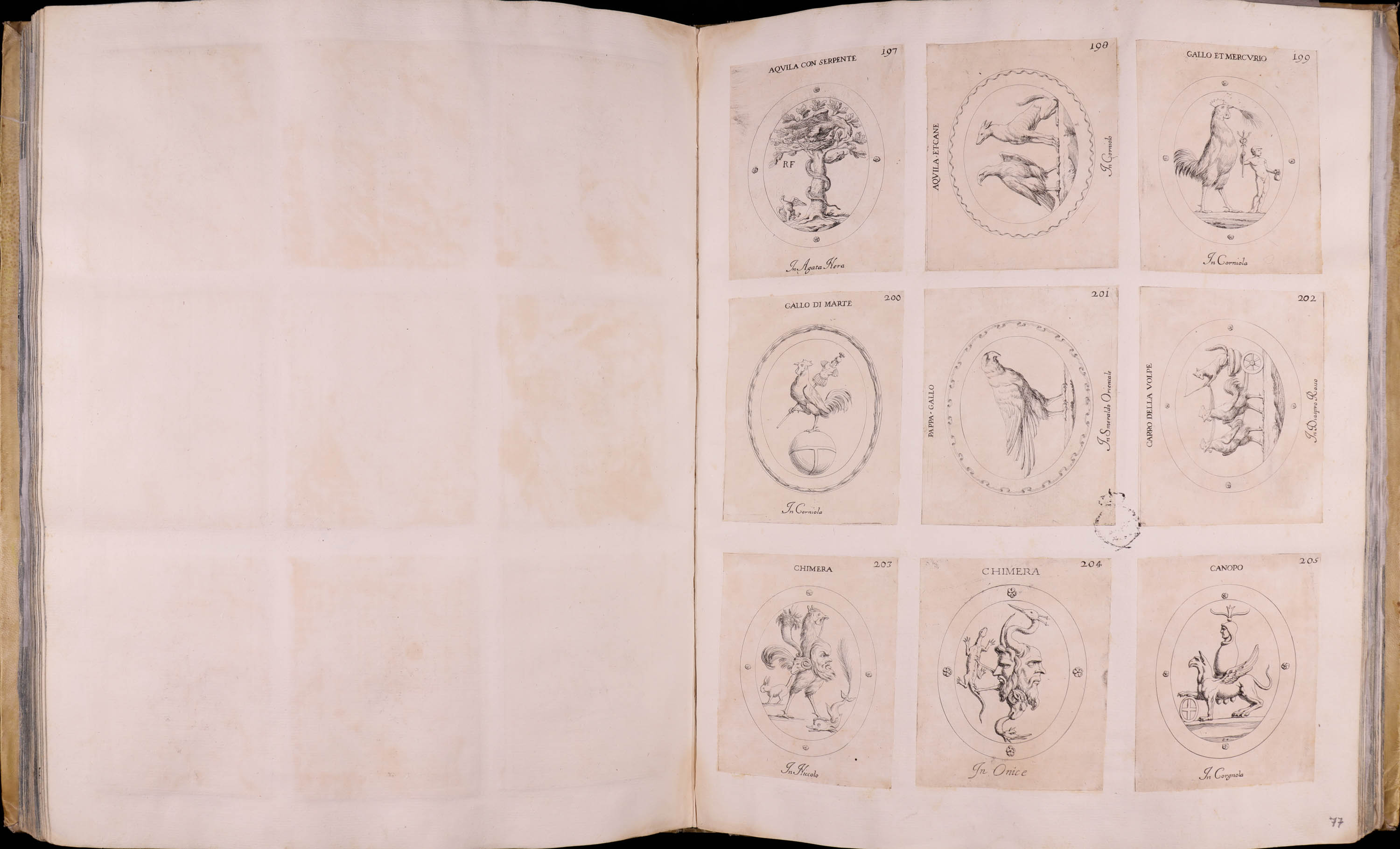 Primera edición del primer volumen de dos (incompleto, faltan las primeras hojas de la dedicatoria al papa Alejandro VII, advertencia al lector e índice de las láminas), que recoge la colección de camafeos y gemas del cardenal Francesco Barberini en 214 aguafuertes.