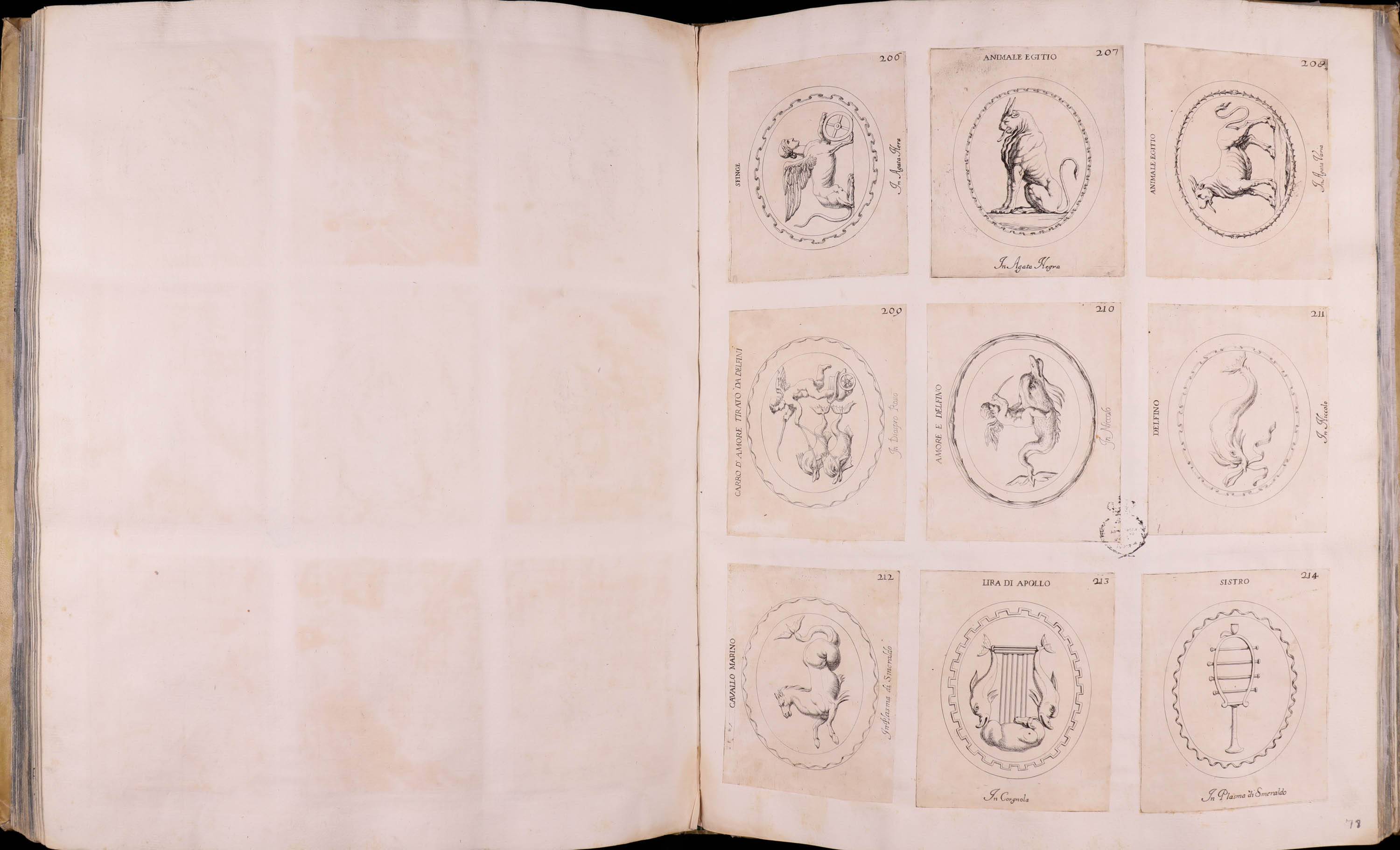 Primera edición del primer volumen de dos (incompleto, faltan las primeras hojas de la dedicatoria al papa Alejandro VII, advertencia al lector e índice de las láminas), que recoge la colección de camafeos y gemas del cardenal Francesco Barberini en 214 aguafuertes.