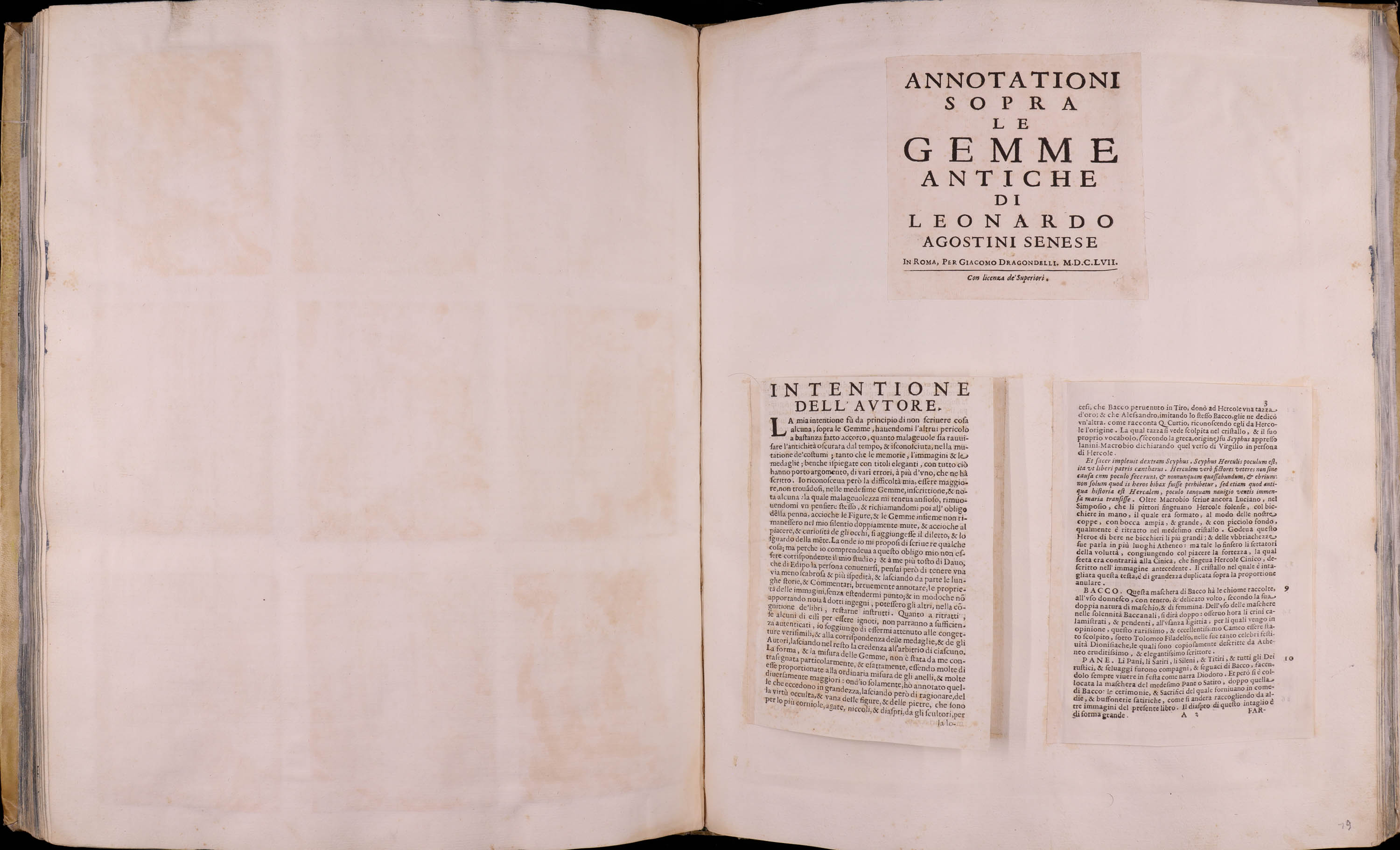 Leonardo Agostini a las estampas en la primera edición del primer volumen de dos (incompleto, faltan las primeras hojas de la dedicatoria al papa Alejandro VII, advertencia al lector e índice de las láminas), que recoge la colección de camafeos y gemas del cardenal Francesco Barberini en 214 aguafuertes.