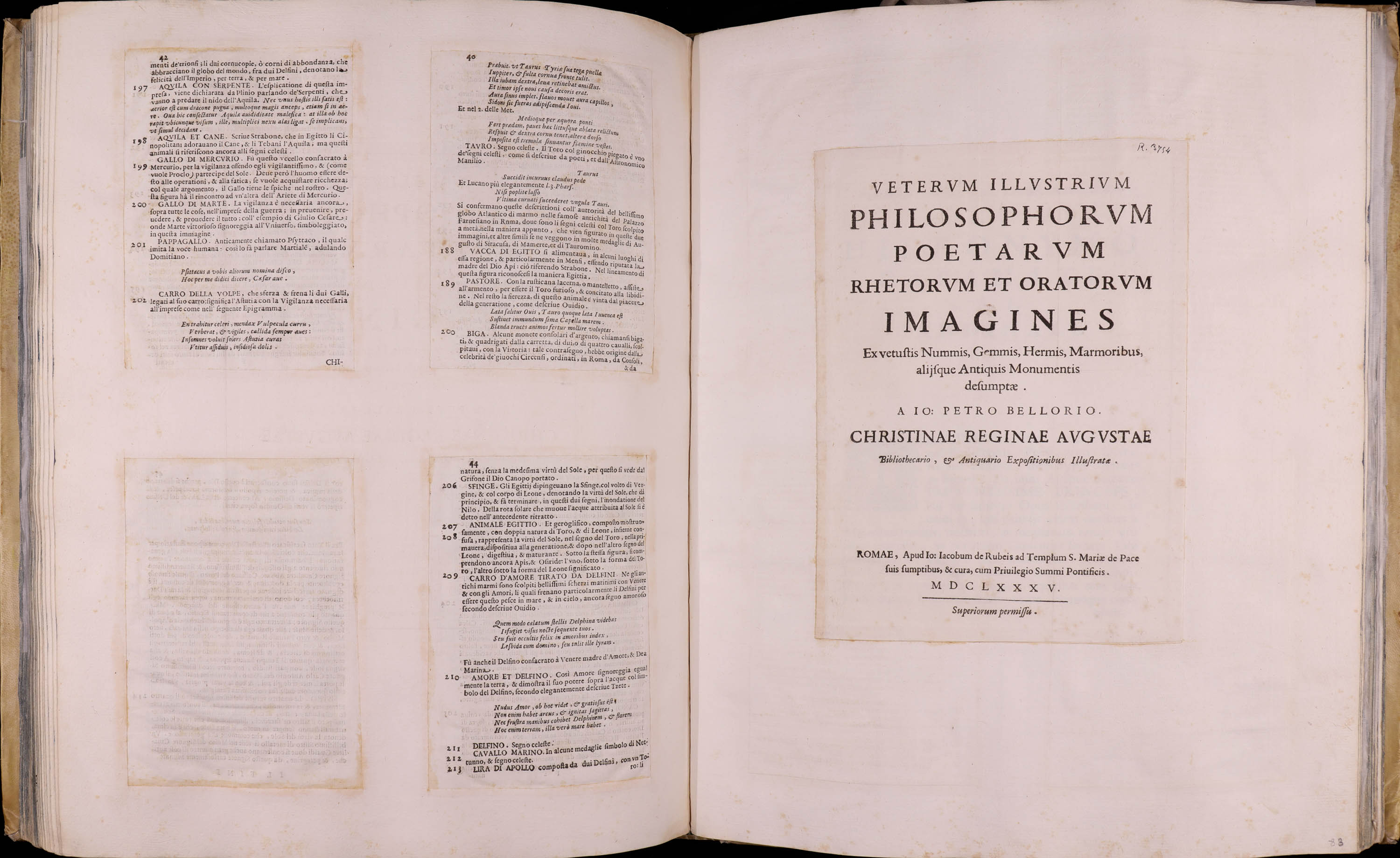 Inscripciones: Titulo: VETERVM ILLVSTRIVM / PHILOSOPHORVM / POETARVM / RHETORVM ET ORATORVM / Ex vetustis Nummis, Gemmis, Hermis, Marmoribus, / alijsque Antiquis Monumentis / desumptae. / A IO: PETRO BELLORIO / CHRISTINAE REGINAE AVGVSTAE / Bibliothecario, & Antiquario Expostionibus Illustrae. // ROMAE, Apud Io: Iacobum de Rubeis ad Templum S. Maria de Pace / suis sumptibus, & cura, cum Priuilegio Summi Pontificis. / M D C L X X X V. / Superiorum permissu.