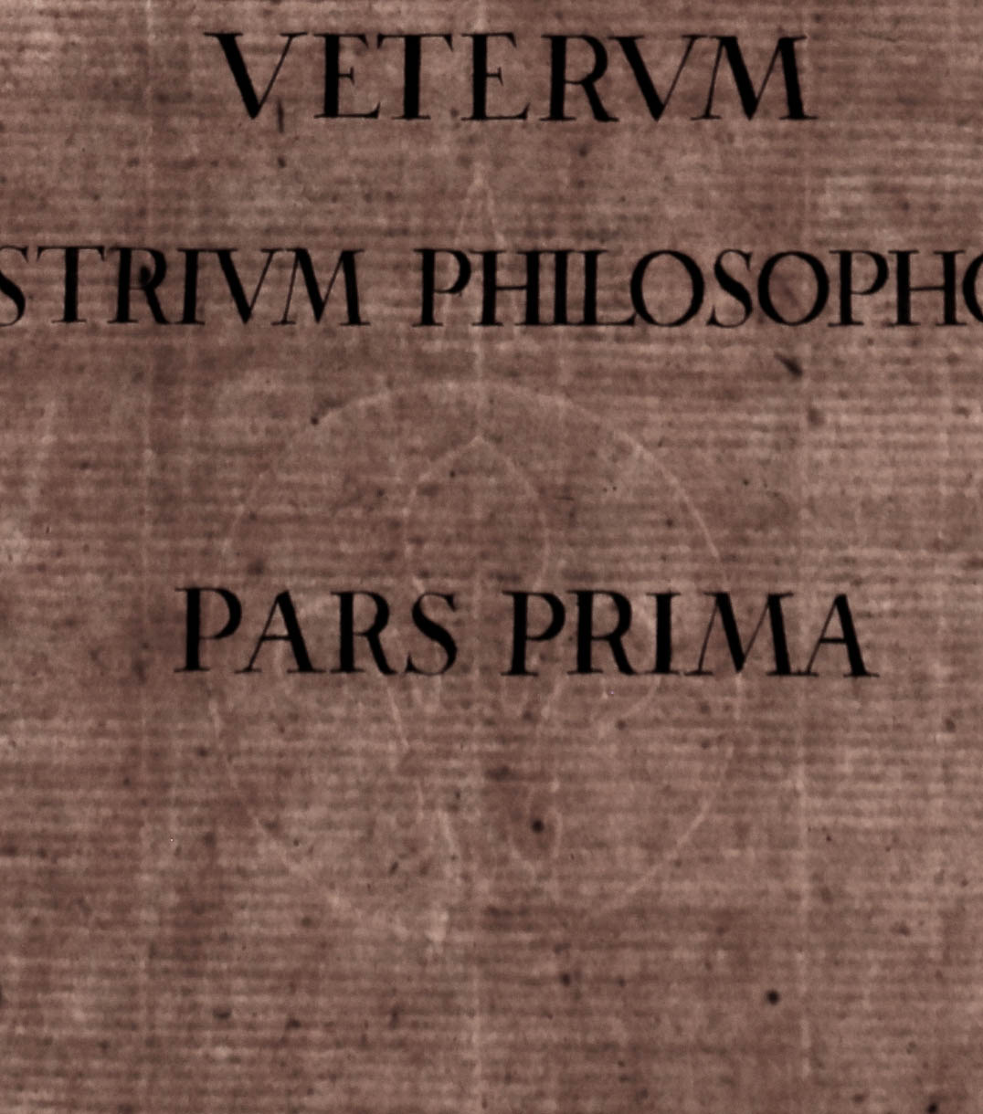 Inscripciones: IMAGINES / VETERVM / ILLVSTRIVM PHILOSOPHORVM / PARS PRIMA / Romae apud Io: Iacobum de Rubeis / Ad templum S(te) Mariae de Pace / cum priuilegio Sumi Pontificis / Ano MDCLXXXV