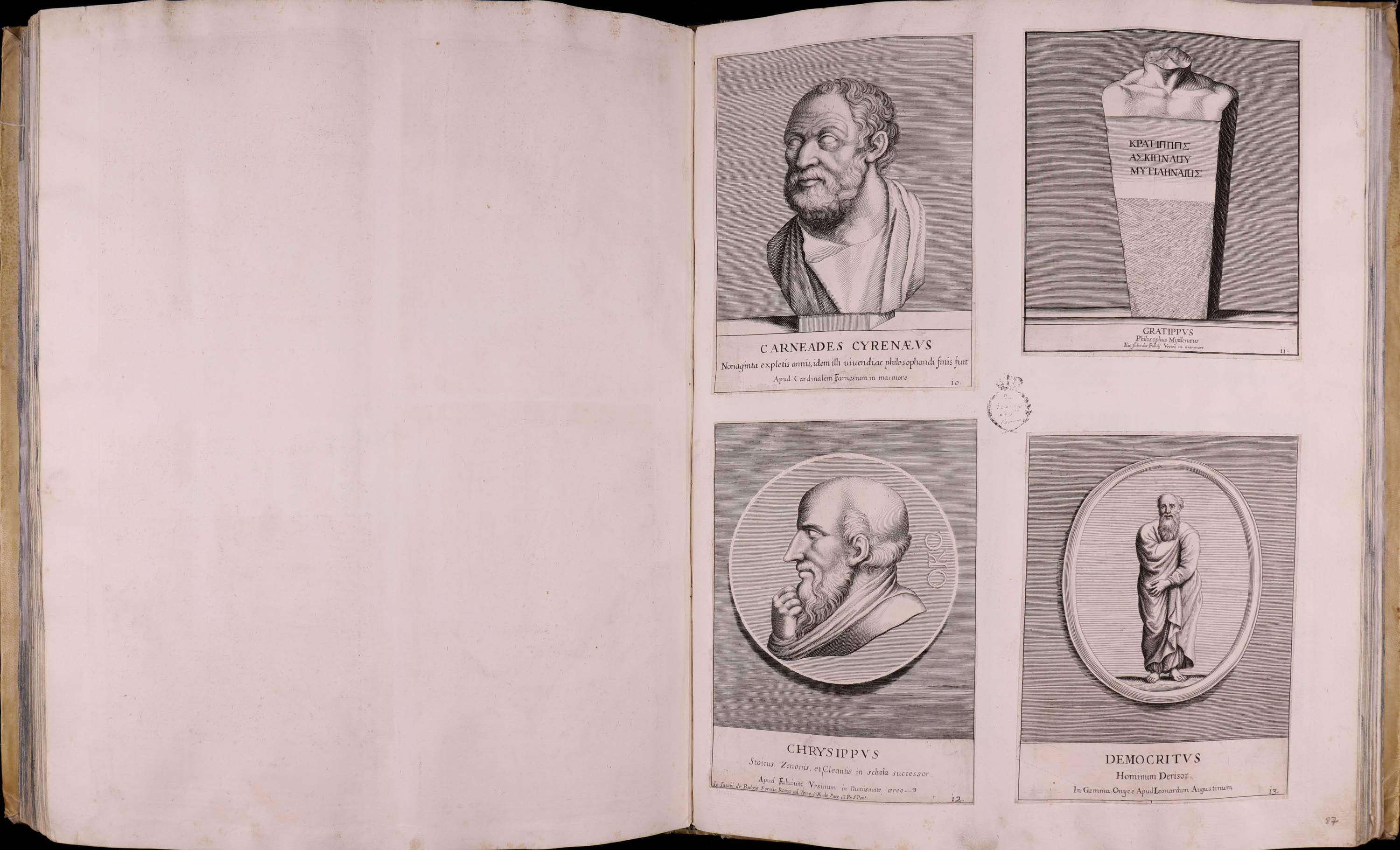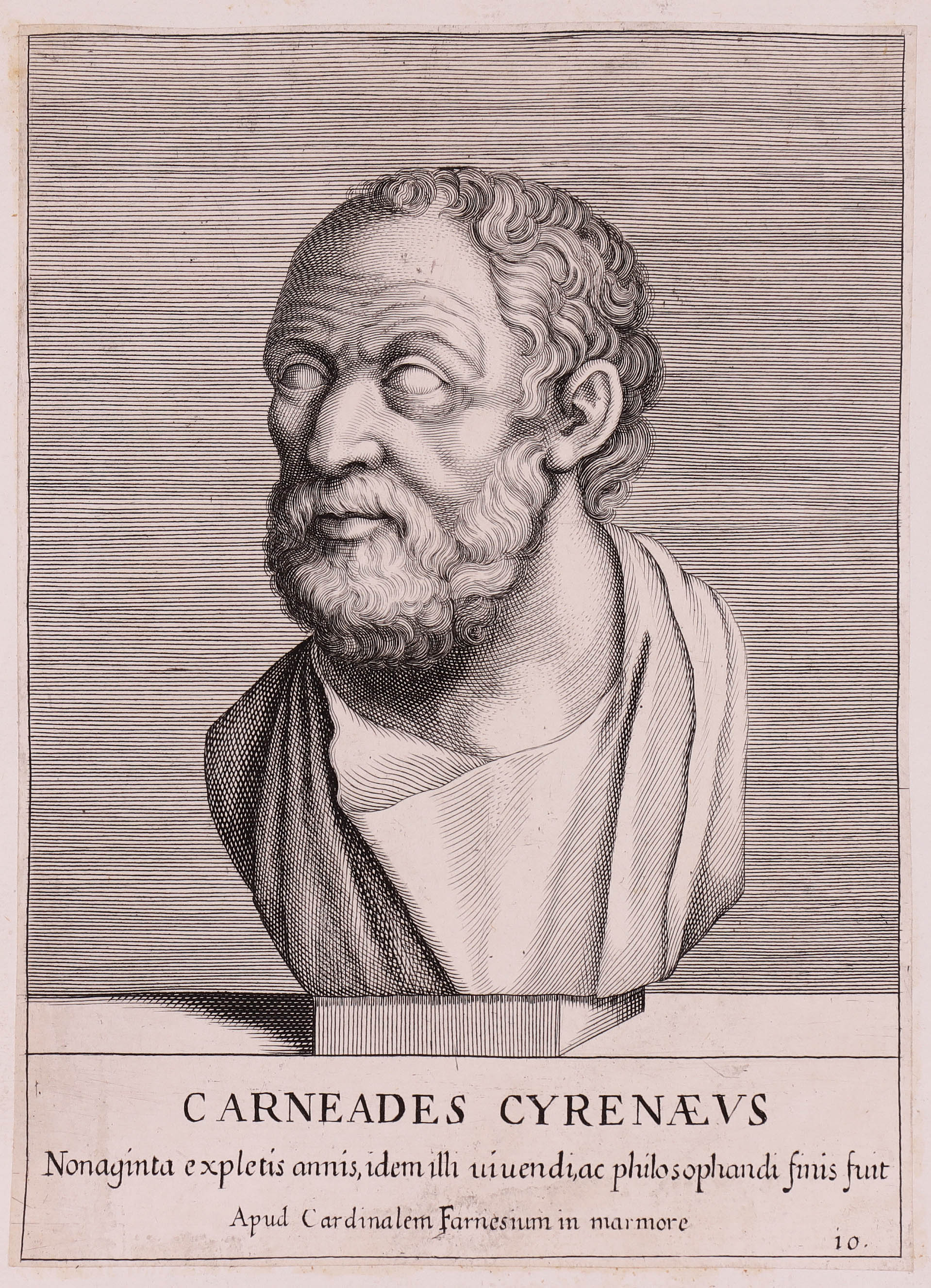 Inscripciones: En la zona inferior: CARNEADES CYRENAEVS / Nonaginta expletis annis, idem illi uiuendi, ac philosophandi finis fuit / Apud Cardinalem Farnesium in marmore