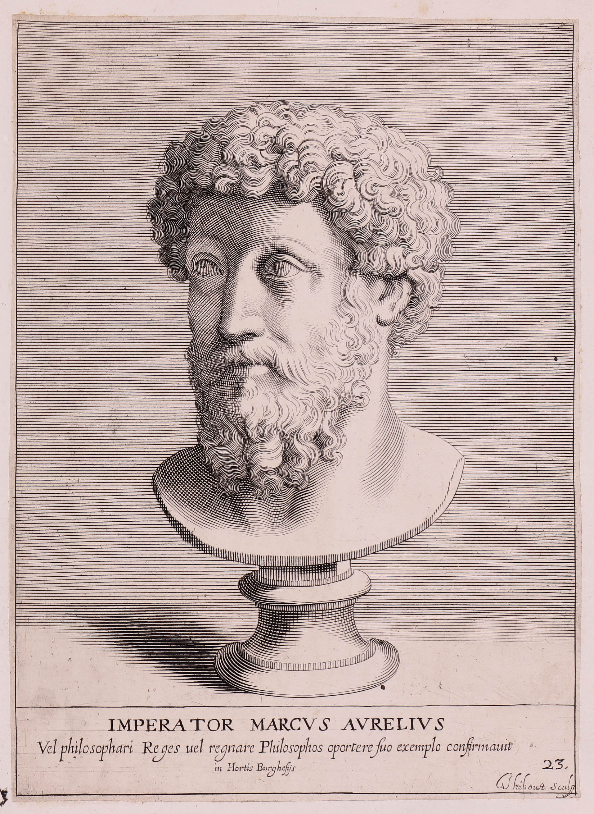 Inscripciones: En la zona inferior: IMPERATOR MARCVS AVRELIVS / Vel philosophari Reges uel regnare Philosophos oportete suo exemplo confirmauit / in Hortis Burghesijs