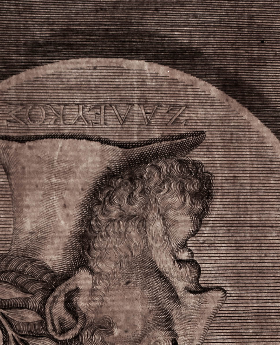 Inscripciones: En la zona inferior: ZALEVCVS / Locrensis legislator / Apud Fuluium Vrsinum in Nomismate argenteo