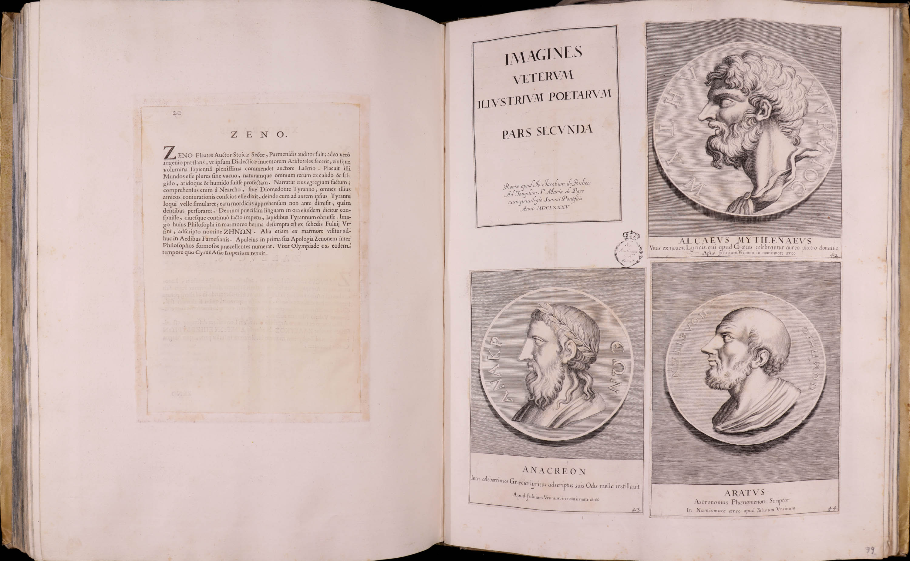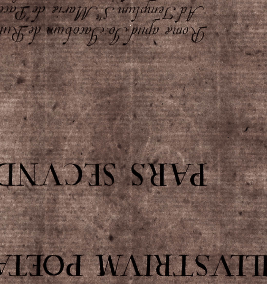 Inscripciones: IMAGINES / VETERVM / ILLVSTRIVM POETARVM / PARS SECVNDA / Romae apud Io: Iacobum de Rubeis / Ad Templum S(tae) Mariae de Pace / cum priuilegio Summi Pontificis / Anno MDCLXXXV