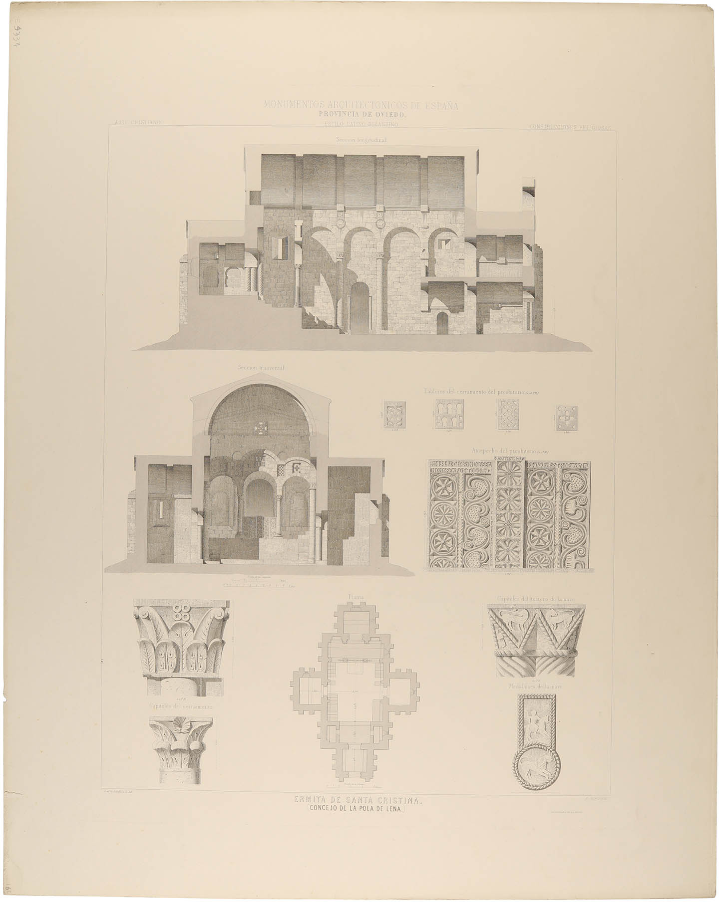 Inscripciones: MONUMENTOS ARQUITECTÓNICOS DE ESPAÑA// PROVINCIA DE OVIEDO// ARTE CRISTIANO/ ESTILO LATINO-BIZANTINO// CONSTRUCCIONES RELIGIOSAS// Sección longitudinal// Sección transversal// Tableros del cerramiento del presbiterio// Antepecho del presbiterio// Capiteles del cerramiento// Planta// Capiteles del testero de la nave// Capiteles del cerramiento// Medallones de la nave// ERMITA DE SANTA CRISTINA// (CONCEJO DE LA POLA DE LENA).