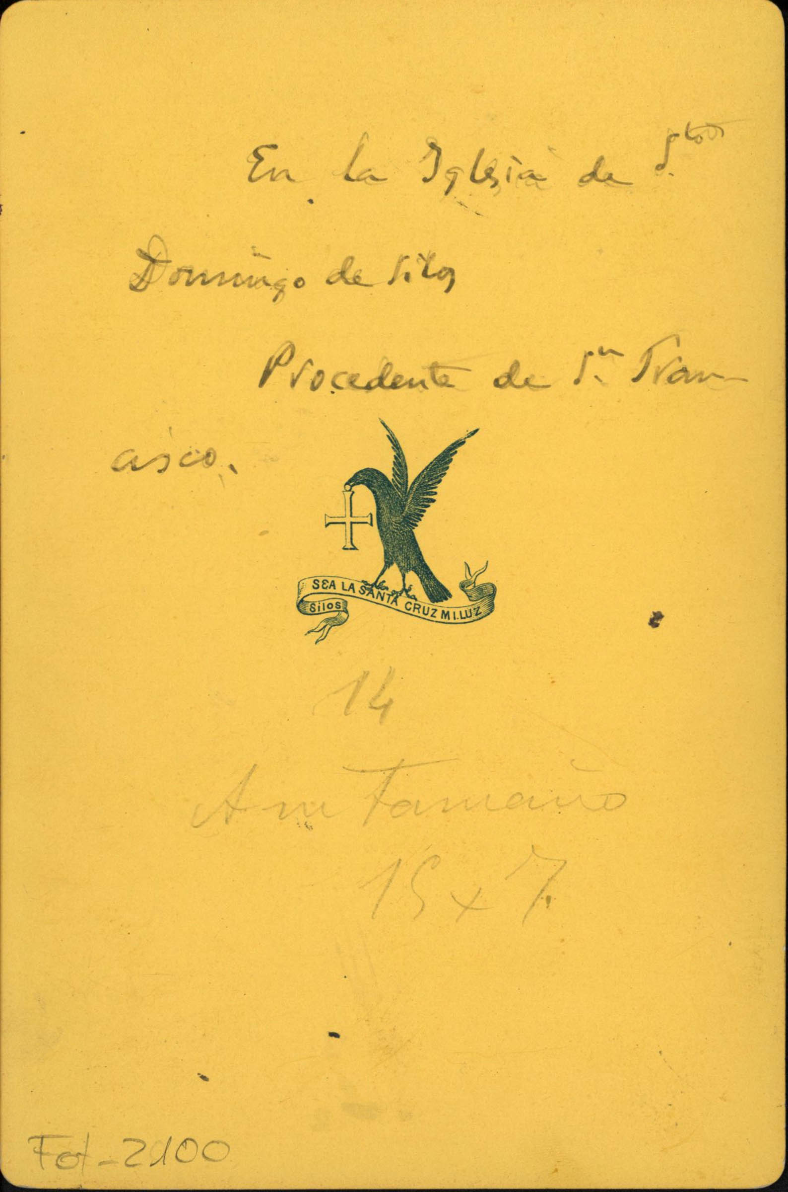 Observaciones: Al verso: en la Iglesia de Stº Domingo de Silos. Procedente de San Francisco. Fue restaurada en 1989 en el ICRBC .