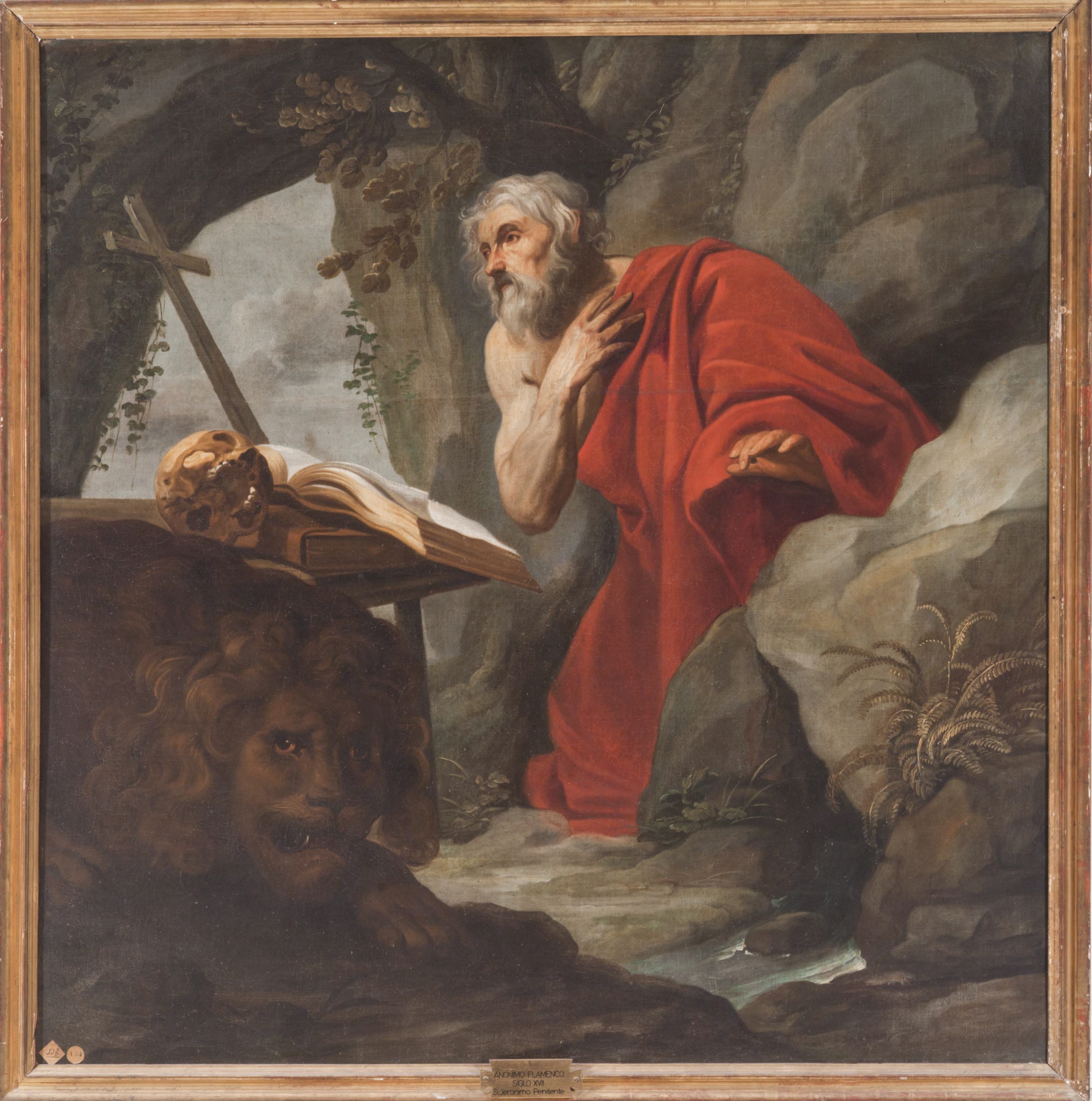 Observaciones: San Jerónimo (342-420), uno de los Padres de la Iglesia, está representado aquí durante su etapa de retiro espiritual y penitencia. En el interior de una gruta abierta al paisaje en el fondo, el santo está arrodillado, con su cuerpo parcialmente cubierto con un manto rojo, y lleva su mano derecha al corazón en señal de arrepentimiento. Delante de él, sobre una mesa, se disponen sus atributos: un crucifijo, una calavera y los libros alusivos a su traducción al latín de la Biblia. Bajo la mesa, en primer plano, sitúa el pintor la la figura de un león, evocando así la leyenda de la curación del animal por parte del santo y la consiguiente fidelidad del mismo hacia su protector, con el que permaneció hasta su muerte.