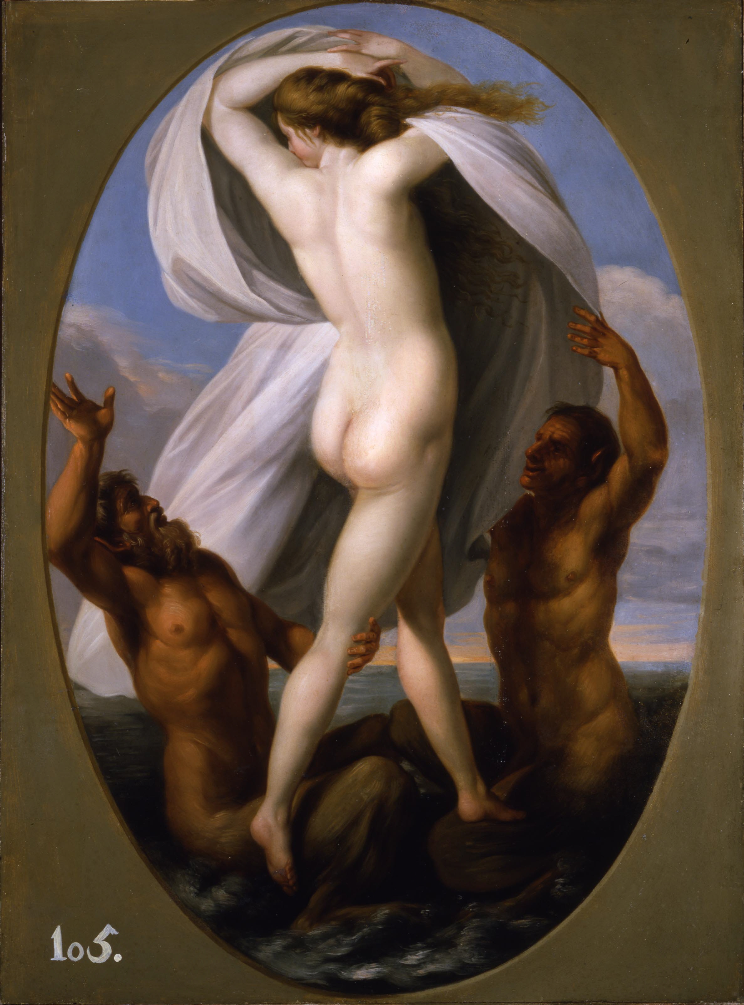 - INVENTARIO de las obras de las tres Nobles Artes y de los Muebles que posee la Real Academia de San Fernando. 1804. Pinturas, [F. 11r] Nº 105. "Una Venus marina sostenida por dos tritones, tabla de tres quartas y media de alto y dos pies de ancho, con marco dorado."