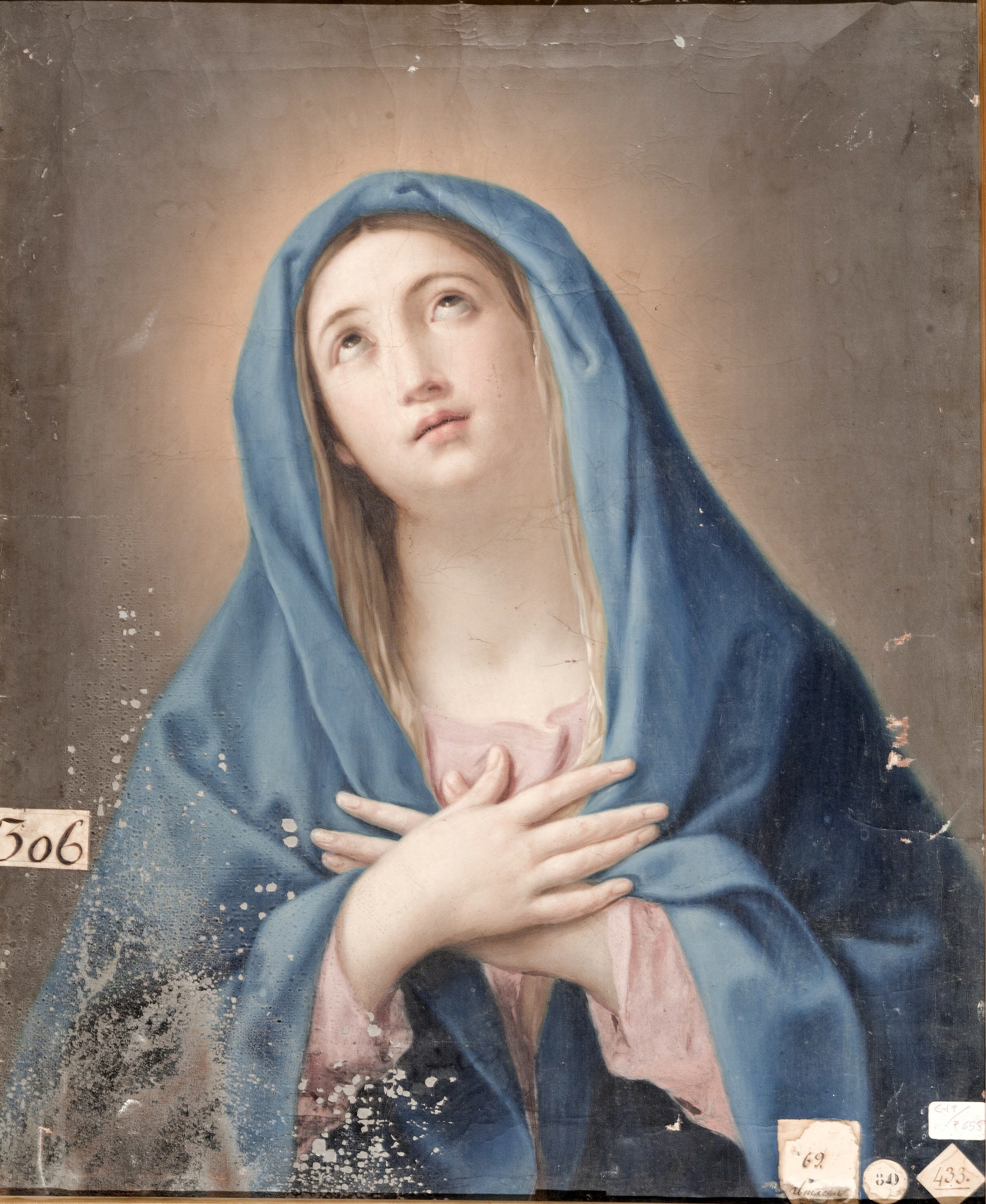 Inventarios:- NOTICIA de las pinturas que posee la Real Academia de San Fernando según el orden de su numeración, [1796-1805]. [fol. 31 v.] Nº 255. "La Virgen Dolorosa de Güido Copiada por Dn . Manl Eraso. Una vara de alto y tres quartas de ancho sin marco. Su Origl en Roma en casa del Conde Boloñeti."