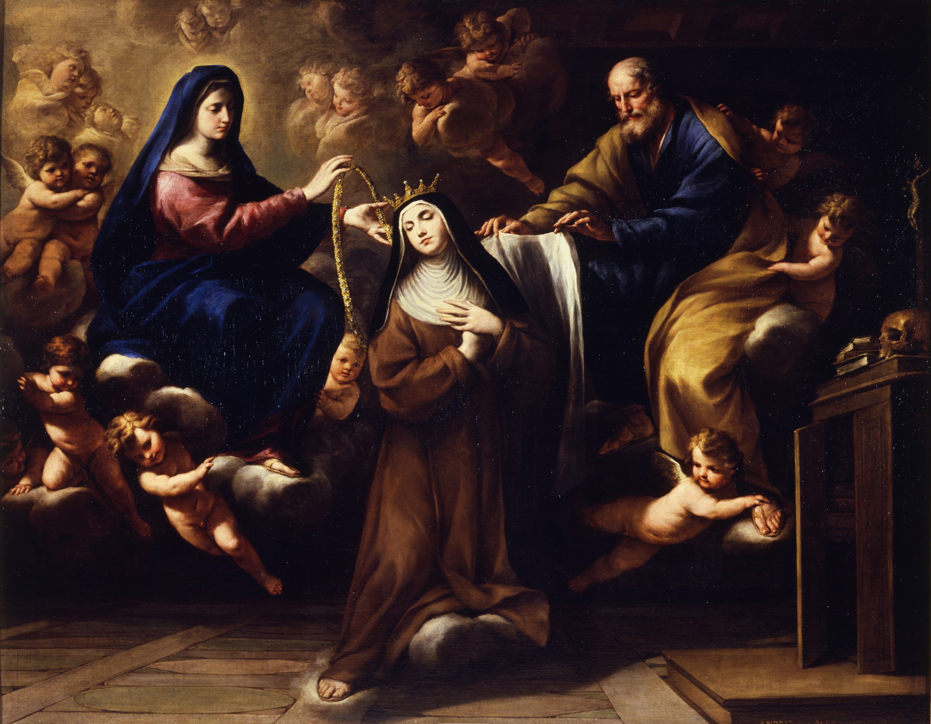 Teresa de Cepeda y Ahumada (1515-1582) fundó la Orden de Carmelitas Descalzos, una rama de la Orden de Nuestra Señora del Monte Carmelo. Escritora y mística, fue beatificada en 1614 y canonizada en 1622. El artista representa a una joven Teresa vistiendo el hábito carmelita y situada entre San José y la Virgen, en el momento de su coronación mística, simbolizada por la corona y el collar. Durante el siglo XVII fue uno de los episodios más representados de la vida de la santa, muchas veces de la mano de artistas anónimos.