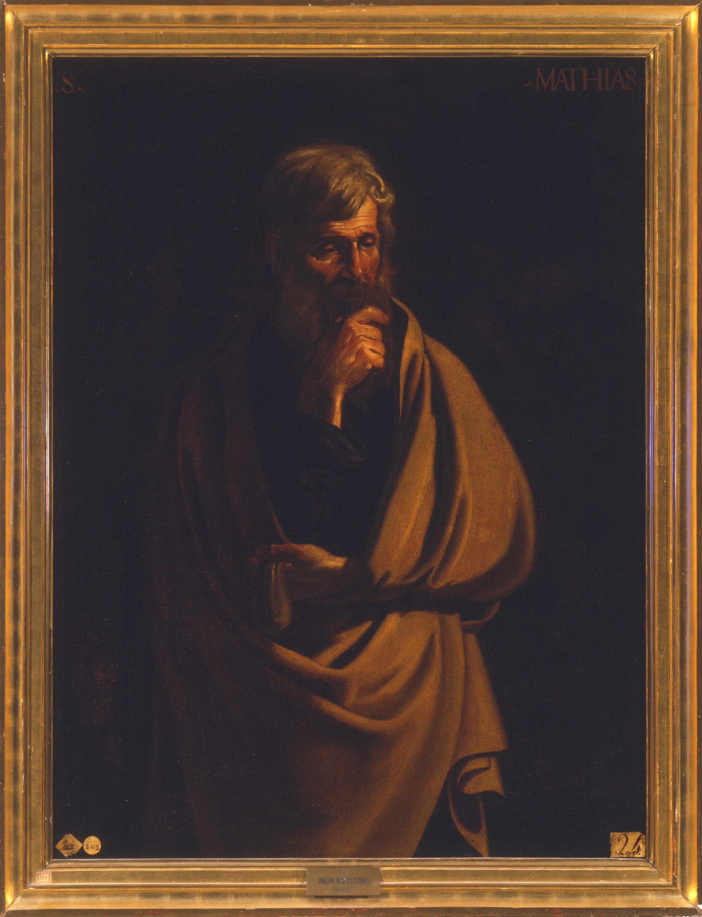 Inscripciones: En la parte superior derecha: "S. MATHIAS", identificación que no presentan el resto de los lienzos del conjunto.