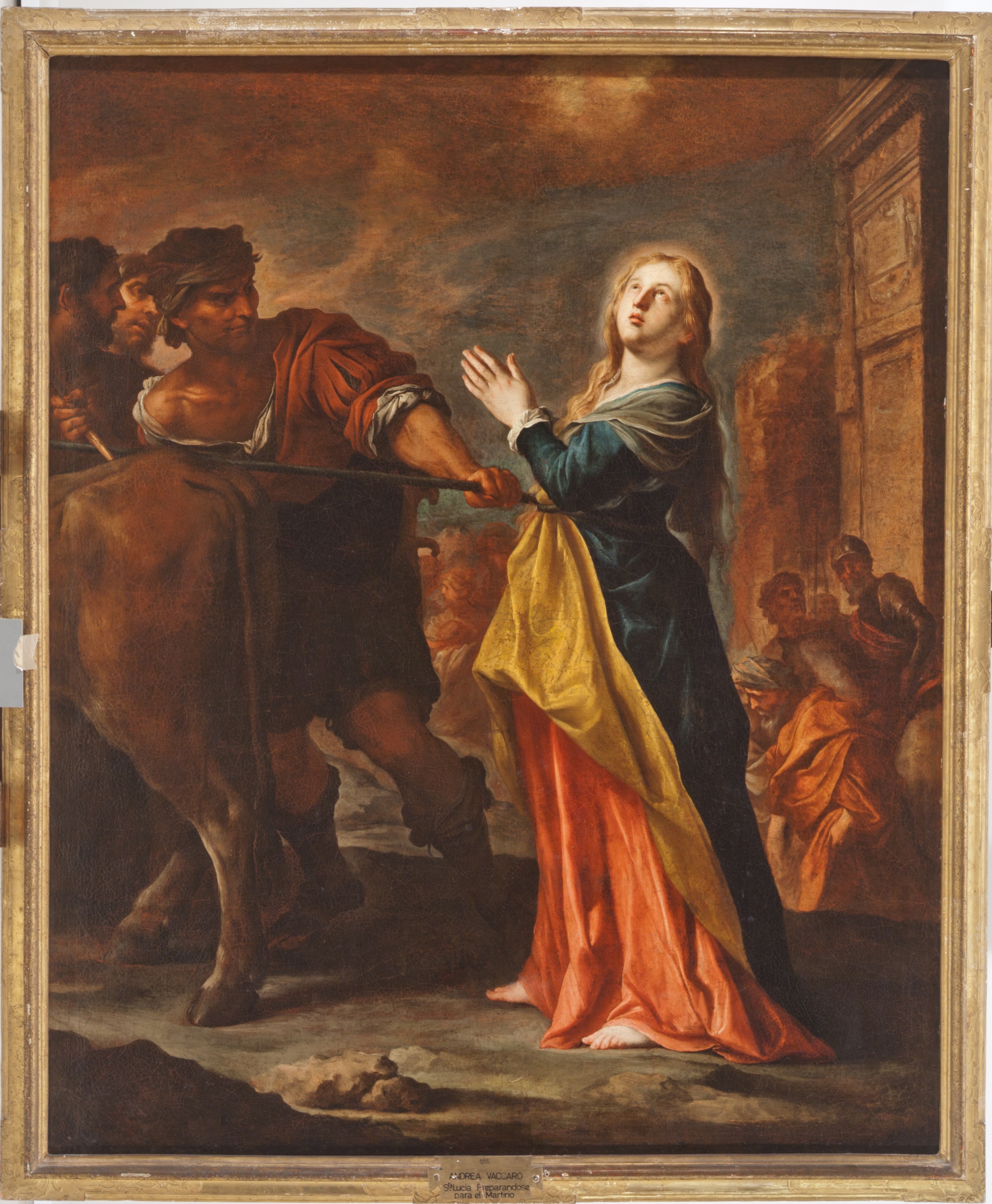 Lucía fue una mártir cristiana nacida en Siracusa y perseguida durante la época de Diocleciano. El artista representa la escena de su prendimiento, captando la tensión entre el esfuerzo de los verdugos por arrastrarla y la sólida firmeza y piedad de la joven.