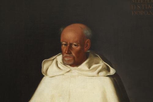 Fray Hernando de Santiago quién sería el único monje que pudo posar para Zurbarán, como lo atestigua la inscripción