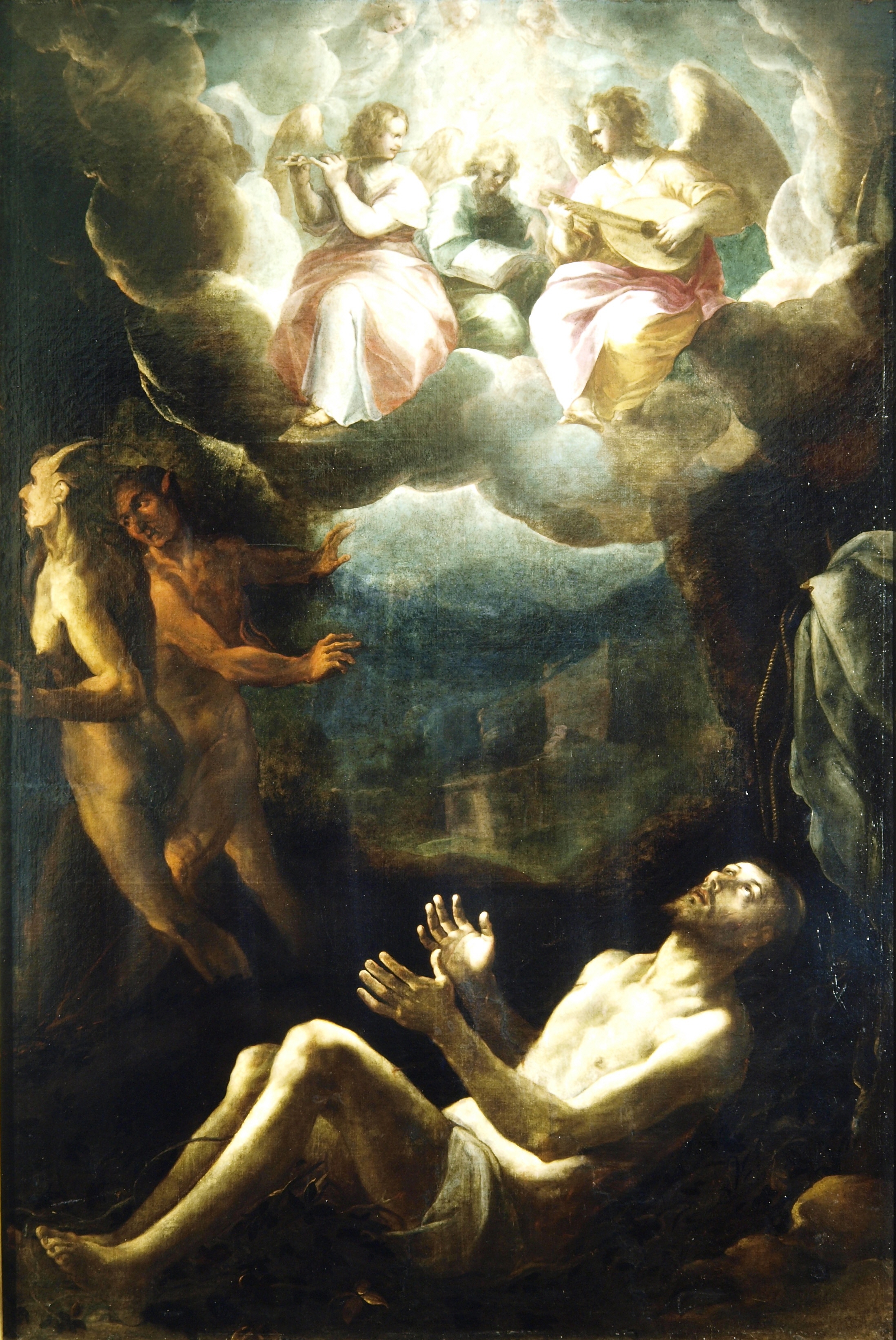 • CATÁLOGO de las Pinturas y Esculturas que se conservan en la Real Academia de San Fernando. Madrid, por Ibarra, Impresor de Cámara de Su Majestad. 1824. [P. 65] Antesala. A la sala de pinturas reservadas. Pinturas. Nº 6. "San Francisco desnudo en la zarza con una visión de tres ángeles en lo alto, de Vicente Carduci o Carducho."