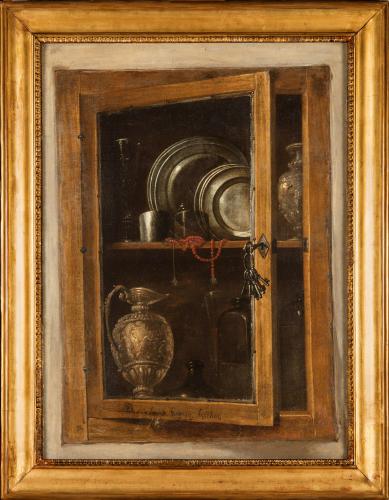 Alacena procedente de una colección sevillana se evoca un mayor refinamiento, un interior acomodado en la Sevilla dieciochesca, cuyo propietario hace guardar bajo llave vasijas y objetos de cierto valor. Las frascas de vidrio y la vajilla de peltre son lo habitual y más común en estos ajuares; pero a su lado vemos dos finas copas de cristal de tipo veneciano,un collar de coral y dos jarras de plata repujada que se adorna con escenas de la Antigüedad clásica enmarcadas por elegantes gallones.
