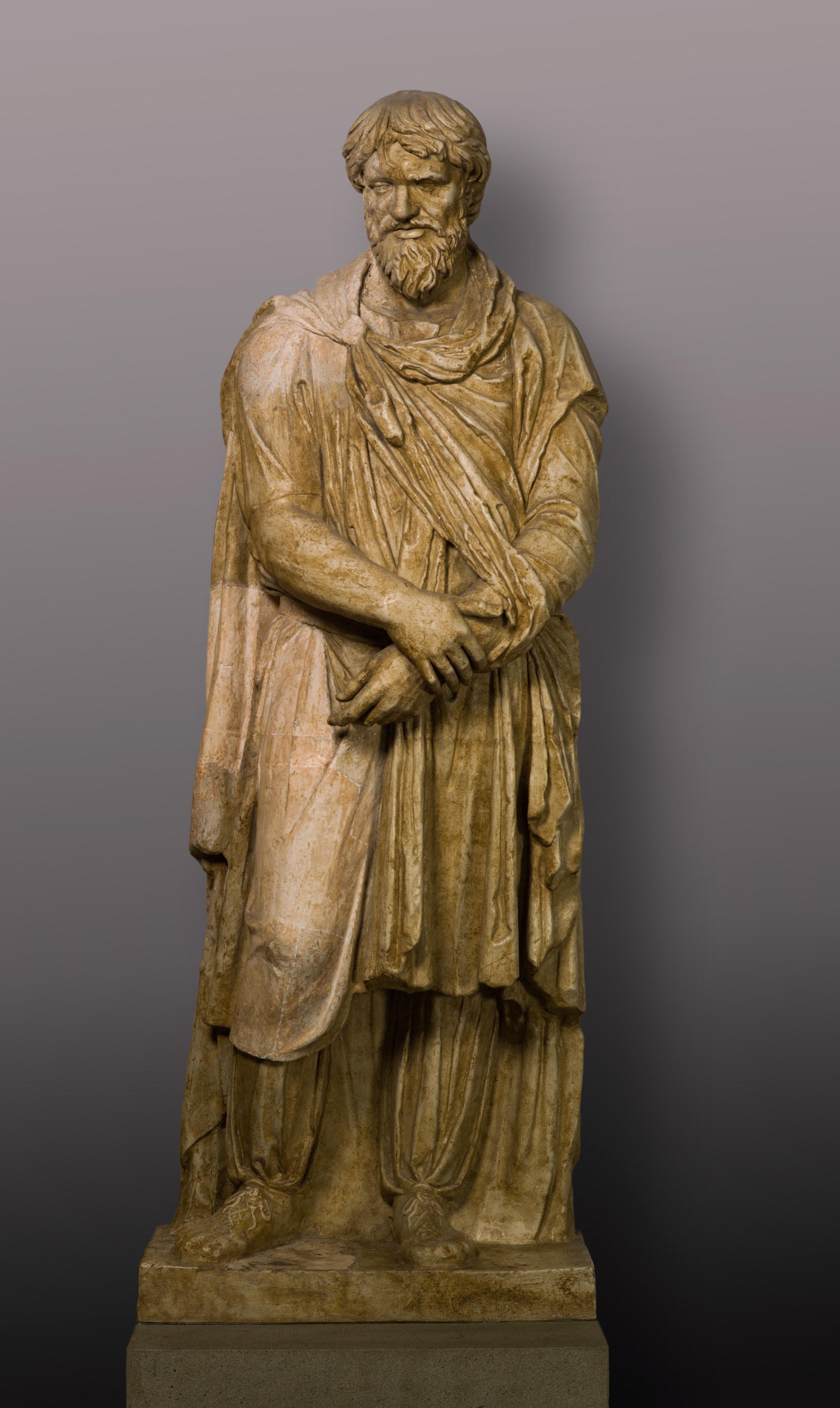 El personaje viste un chitón ajustado a la cintura que llega hasta la rodilla, con manga corta y un manto sobre el pecho recogido con una fíbula en el brazo izquierdo. La cabeza, ligeramente inclinada hacia adelante, es barbada y sigue el tipo de los llamados dacios del tiempo de Trajano. El cabello, dividido a la mitad por una raya central, se ondula hacia las puntas de un modo que recuerda, según Dütschke, a la